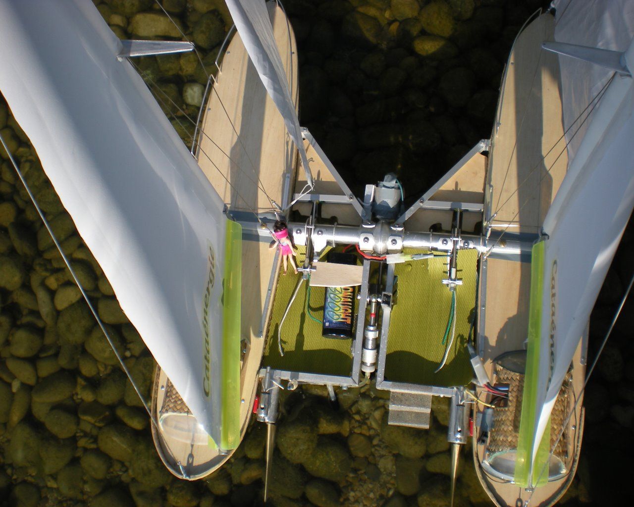 This traditionally built boat, which is 16 meters long, with a 3.5 meters wide carroused hull, and a central axis, generates energy through the oscillation of the hulls that power the system and produce energy from the movement of the waves.