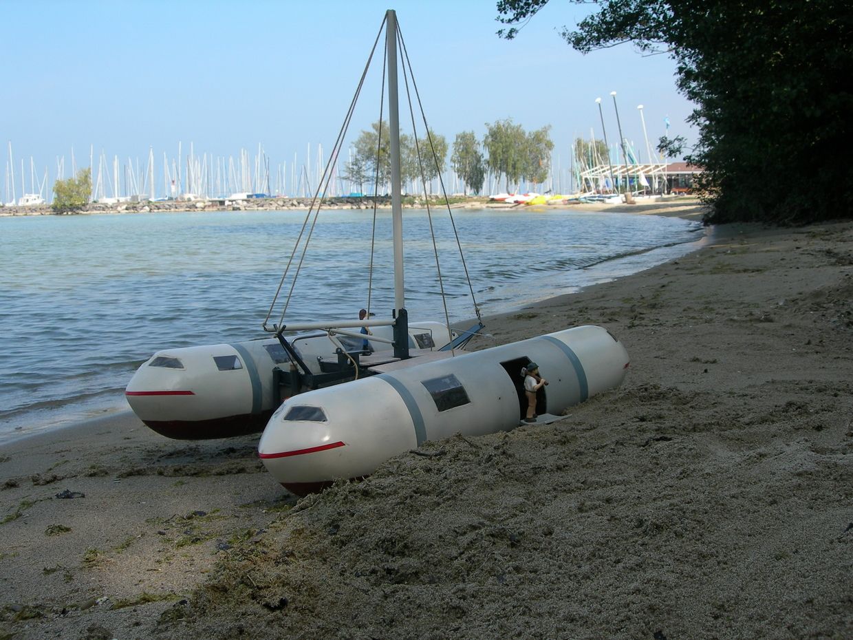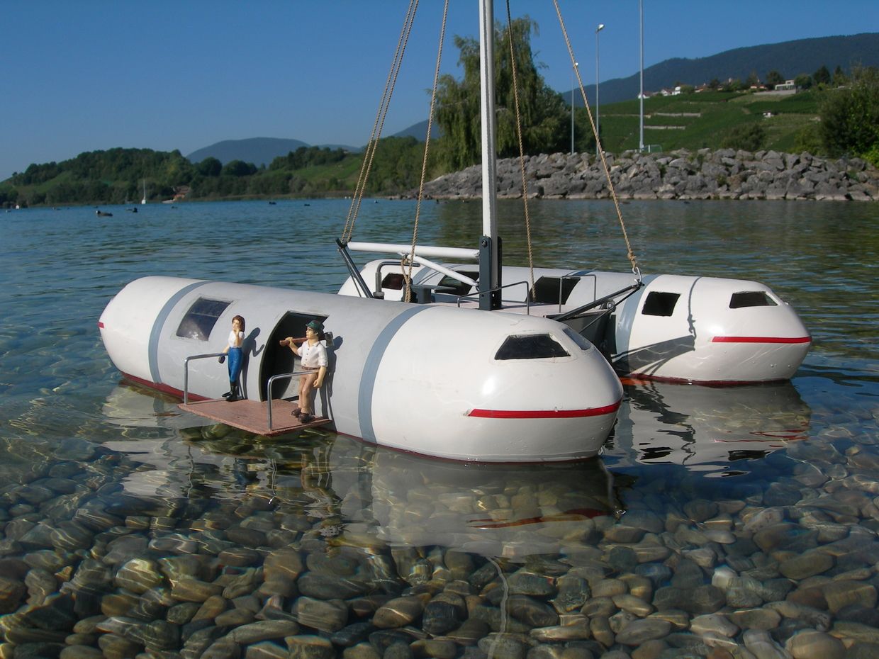 Ce mobilhome a de quoi satisfaire les plus exigeants en recherche d'aventures. Il est idéal pour naviguer et rouler sur les plages grâce à ses roues rétractables qui permettent de passer la nuit sur la terre ferme. Sa largeur totale est de 9 mètres et il est composé de 2 cylindres de 13 mètres de long.